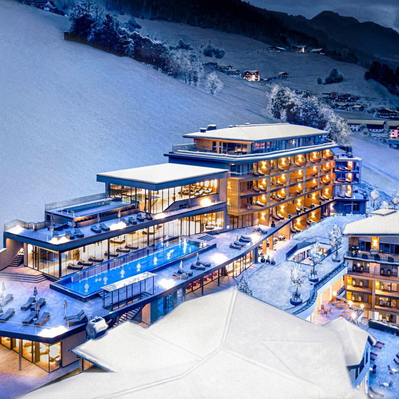 Moderní designový horský hotel, přímo u vleku. Moderní wellness vnitřní tobogány pro děti.