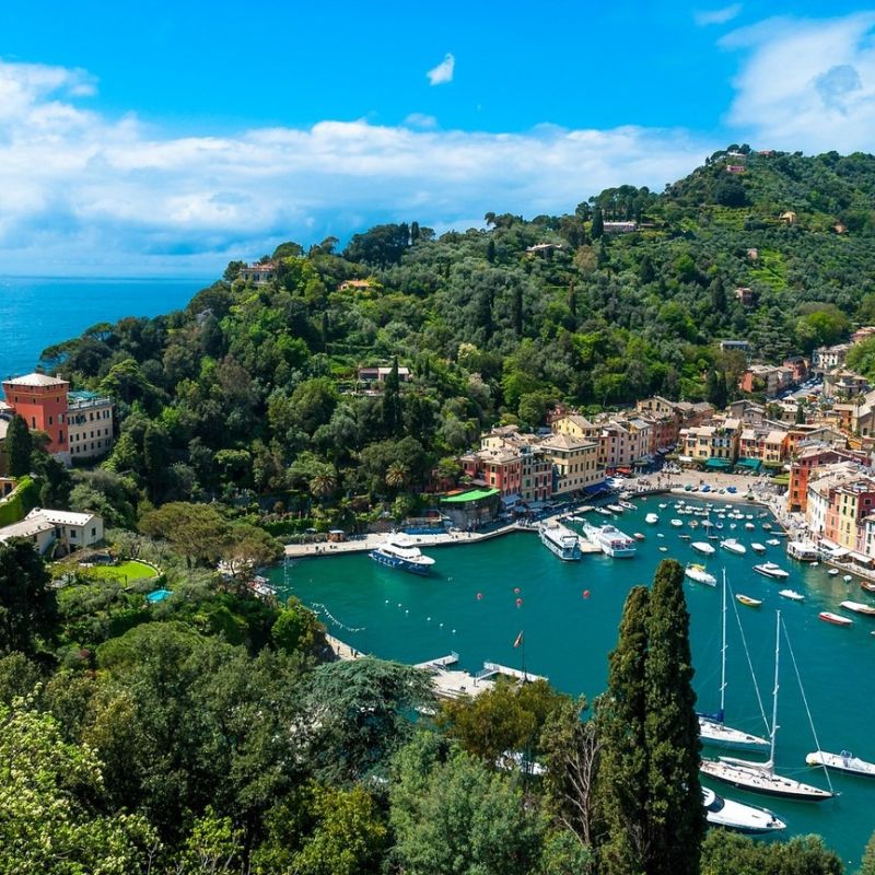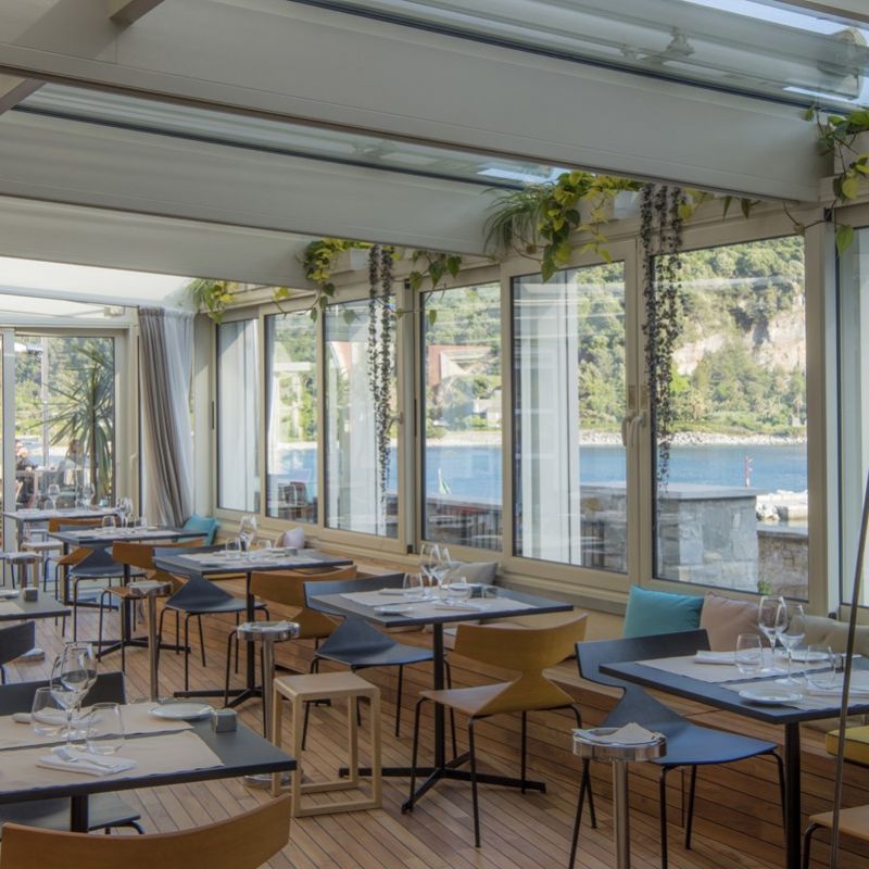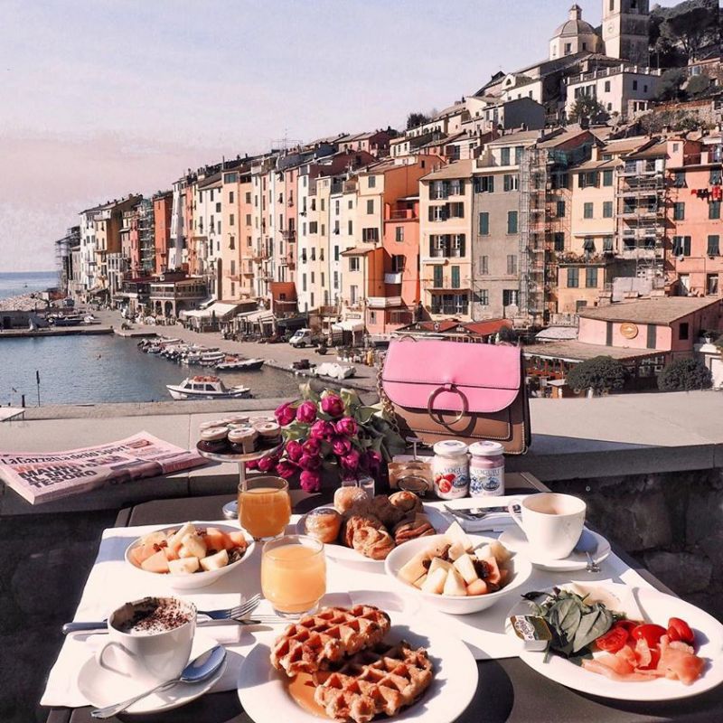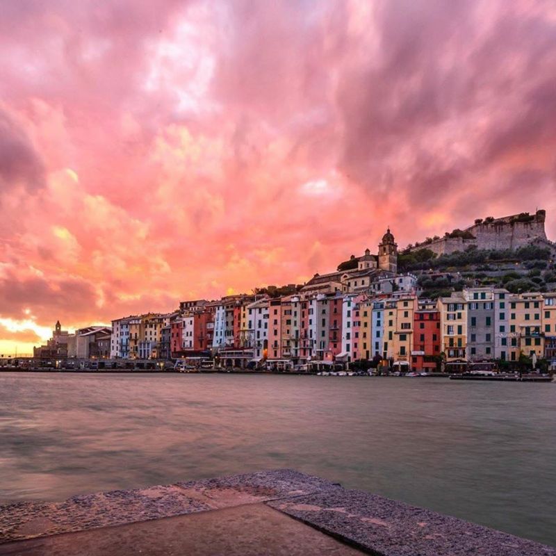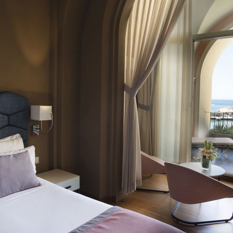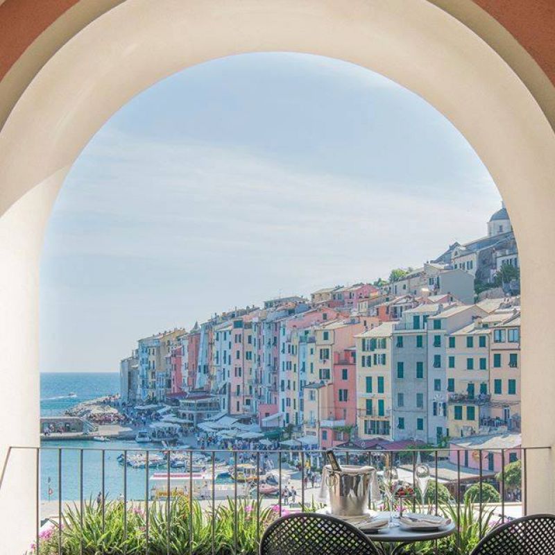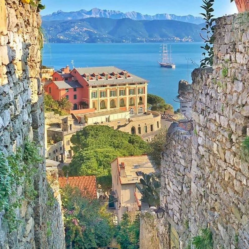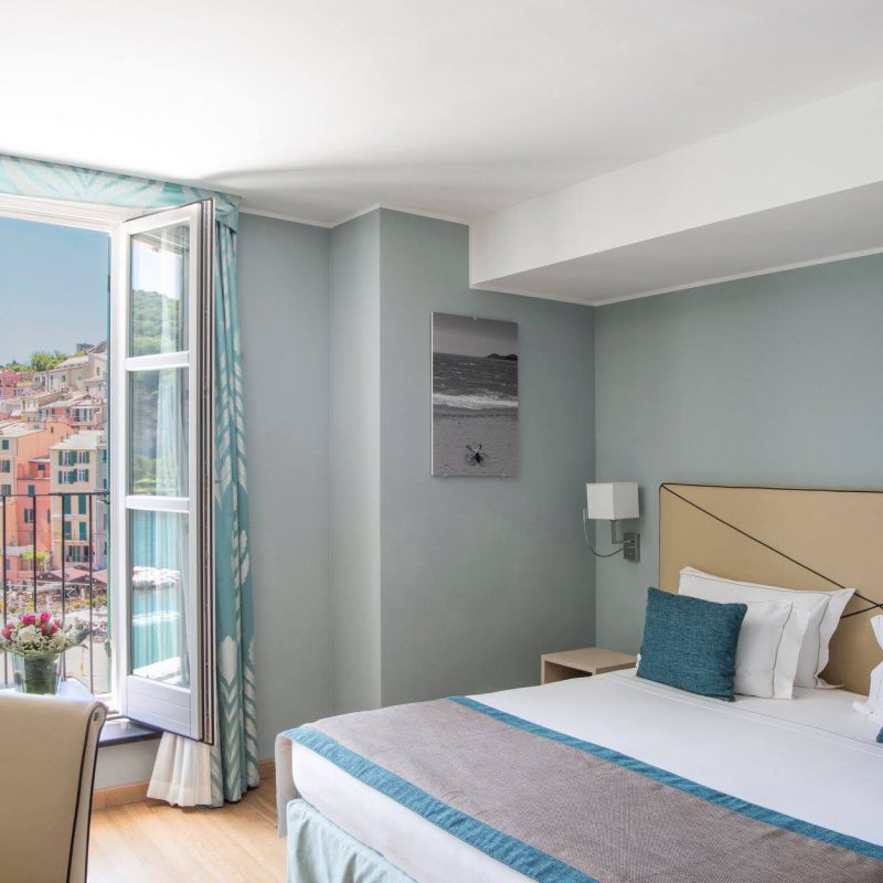 Hotel na pobřeží města Portonovere byl původně kláštěr ze 17. století. Výhled na přístav Palmaria.