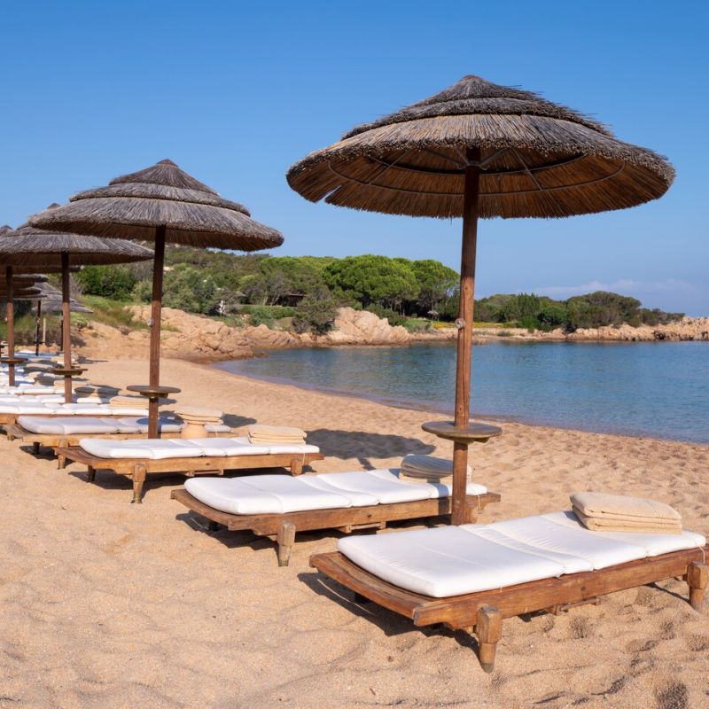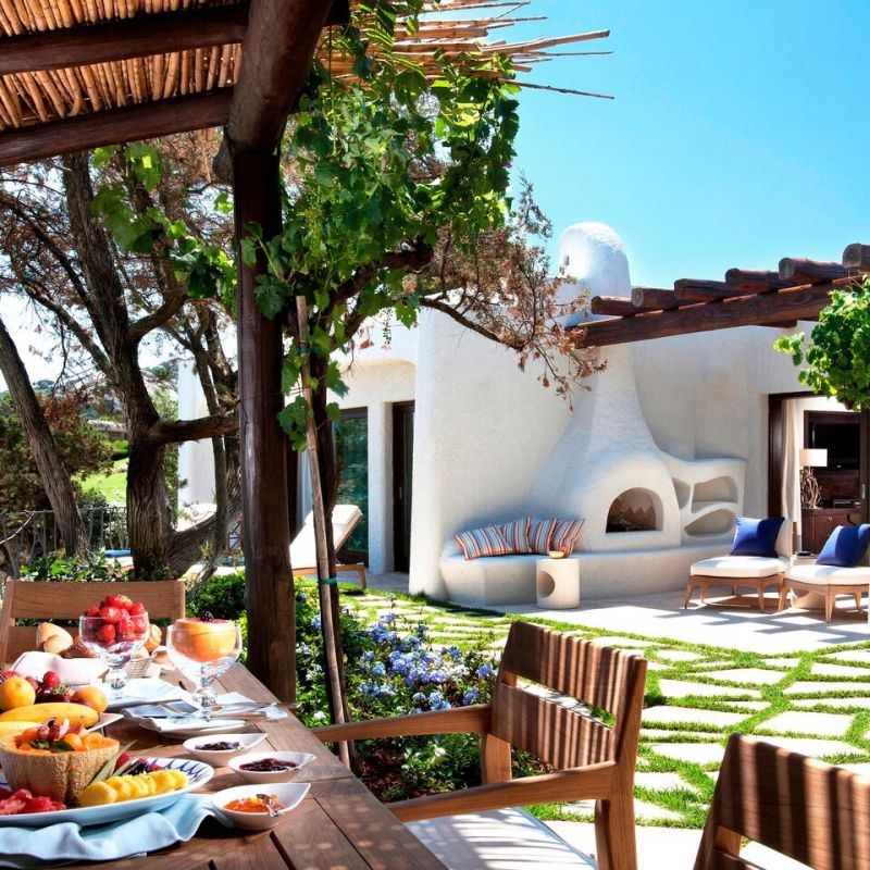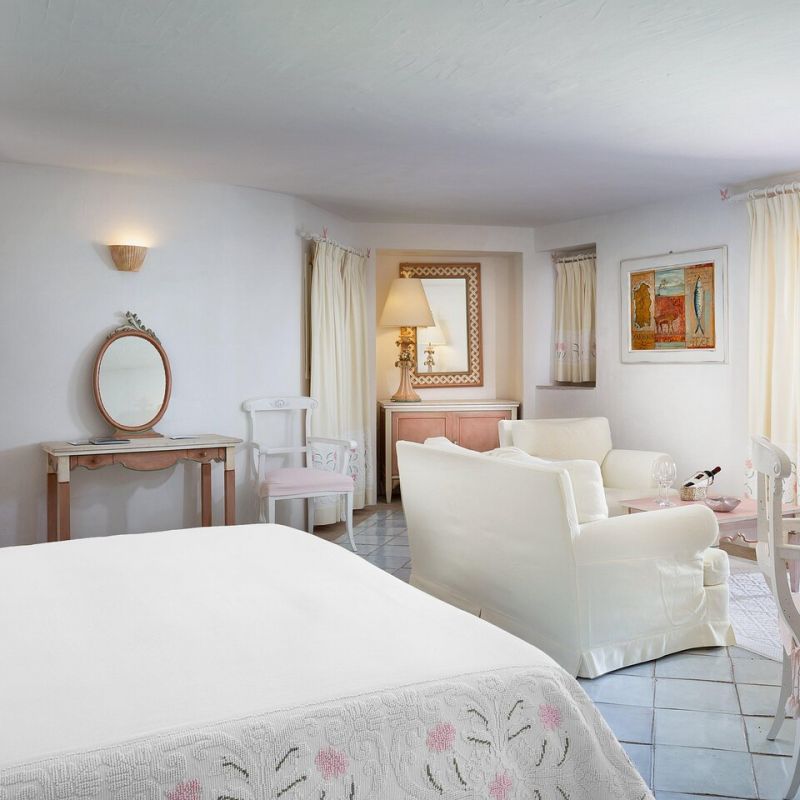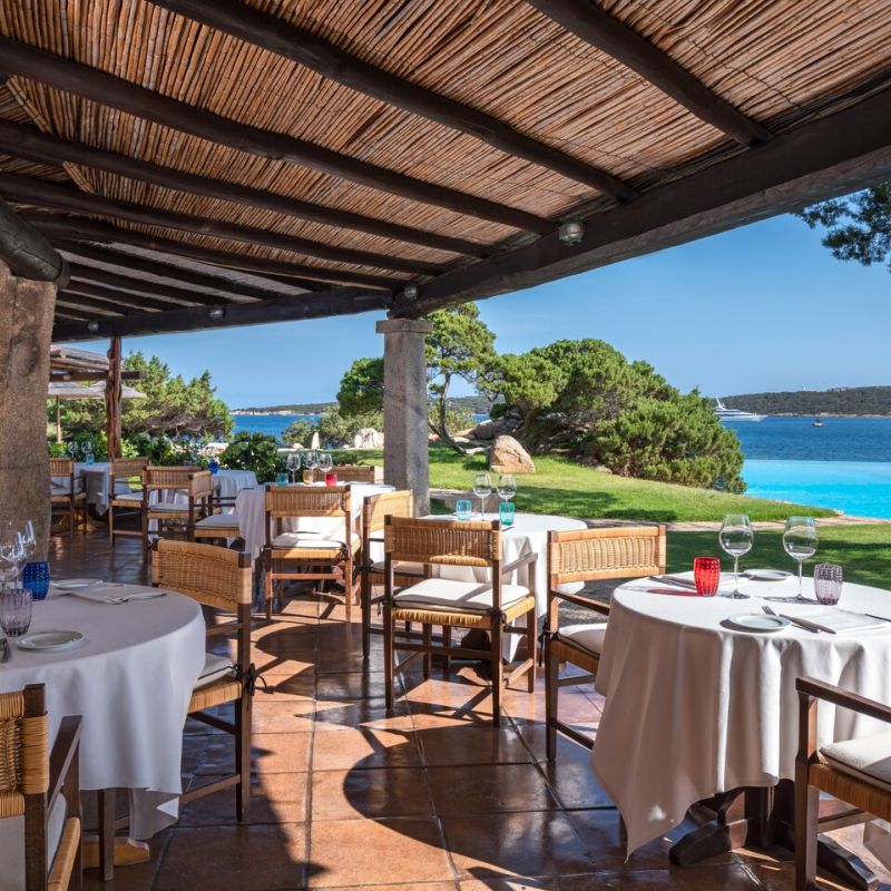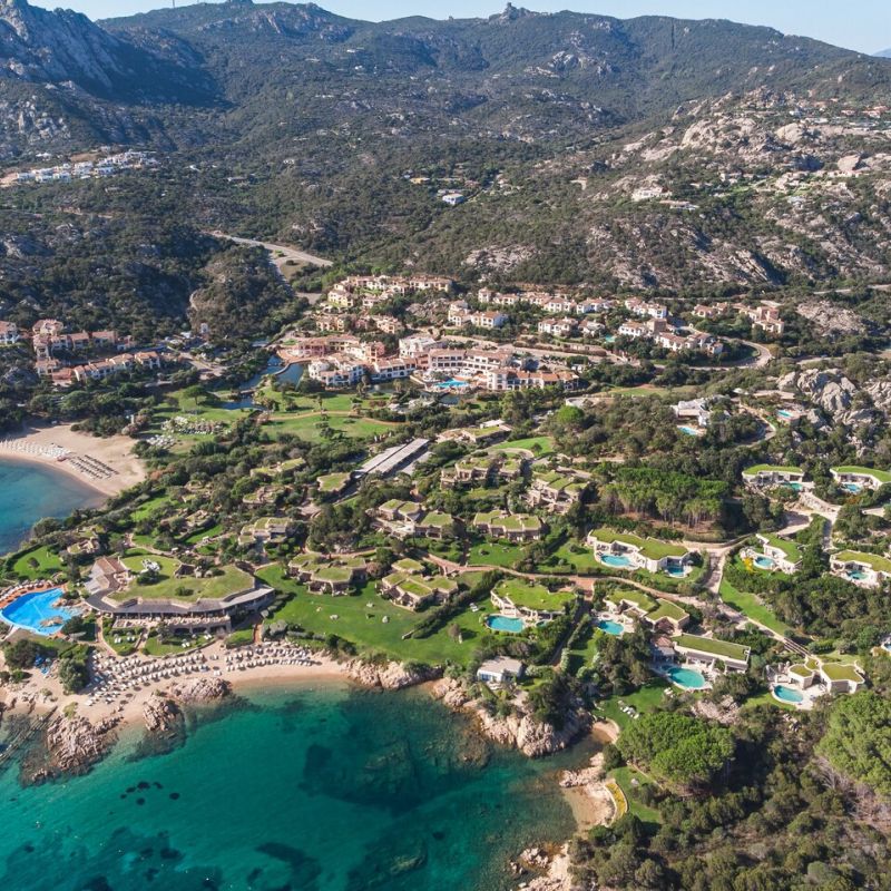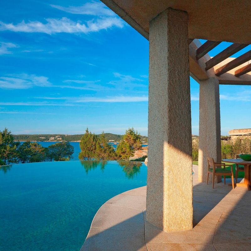 Luxusní hotel s výhledem na pobřeží Costa Smeralda. V blízkosti letoviska Porto Cervo.