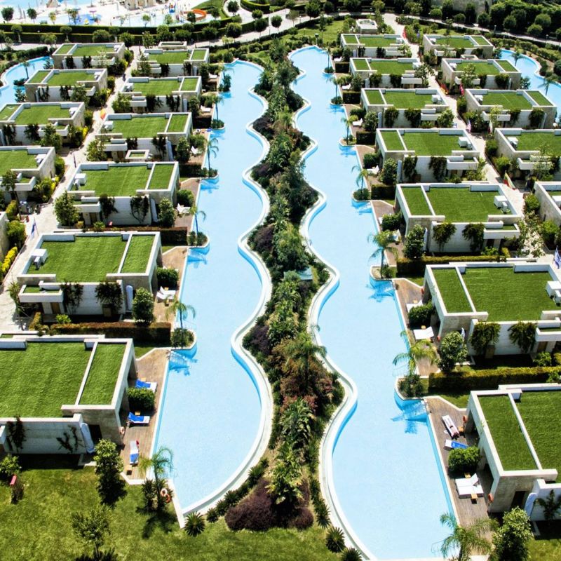 Luxusní komplex, ubytování i ve vilách s bazénem, all inclusive koncept. Vodní svět, Carya Golf Club s umělým osvětlením.