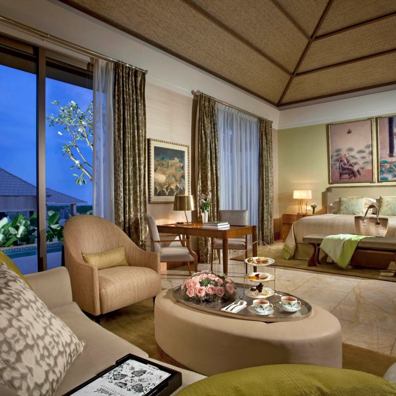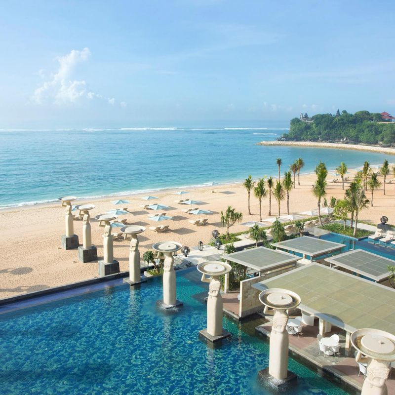 Hotelový komplex Mulia je tvořený ze 3 samostatných odlišných částí - Mulia Resort, Mulia Villas a The Mulia. Přímo u komplexu písečná pláž Nusa Dua. Velké množství restaurací, rekreačních zařízení a obchodů.