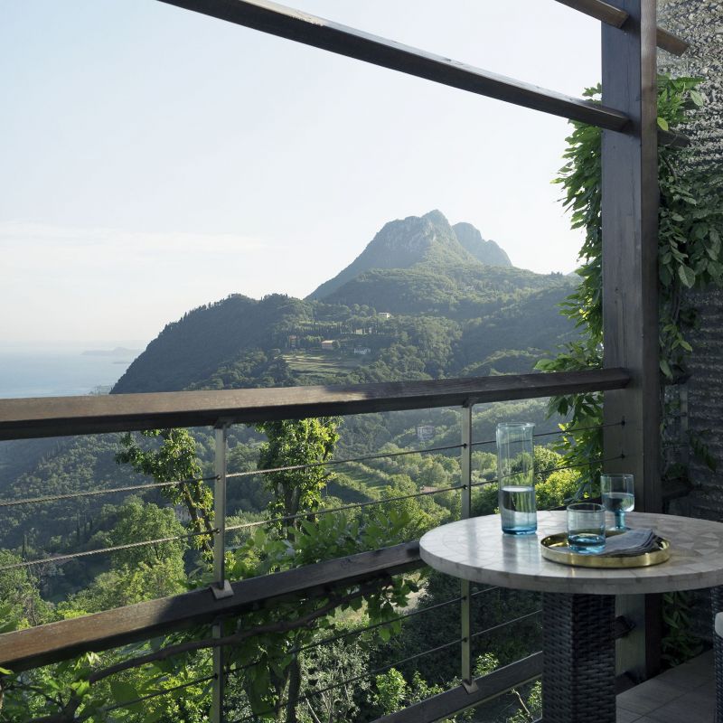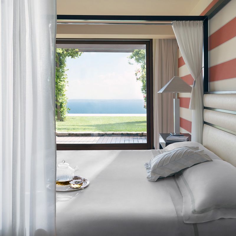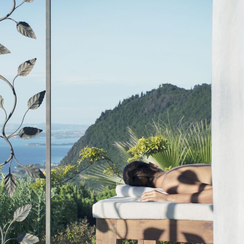 Na břehu jezera Lago Di Garda, obklopený lesnatými kopci a olivovými háji.