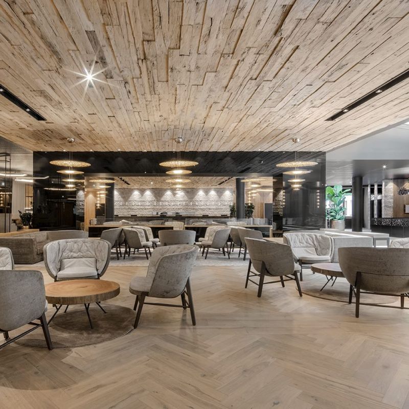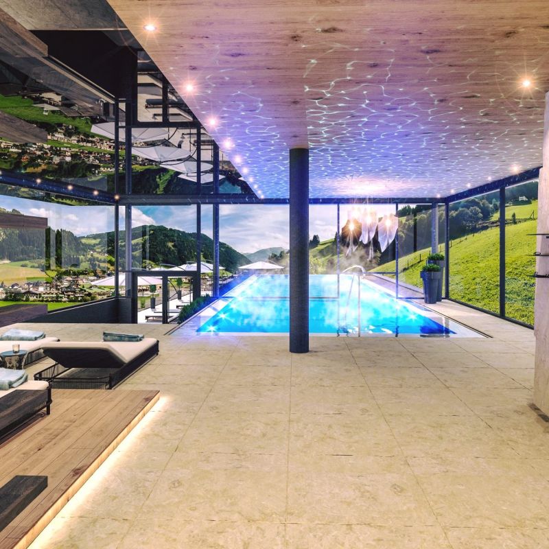 Moderní designový horský hotel, přímo u vleku. Moderní wellness vnitřní tobogány pro děti.