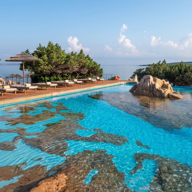 Luxusní hotel s výhledem na pobřeží Costa Smeralda. V blízkosti letoviska Porto Cervo.