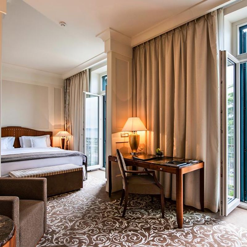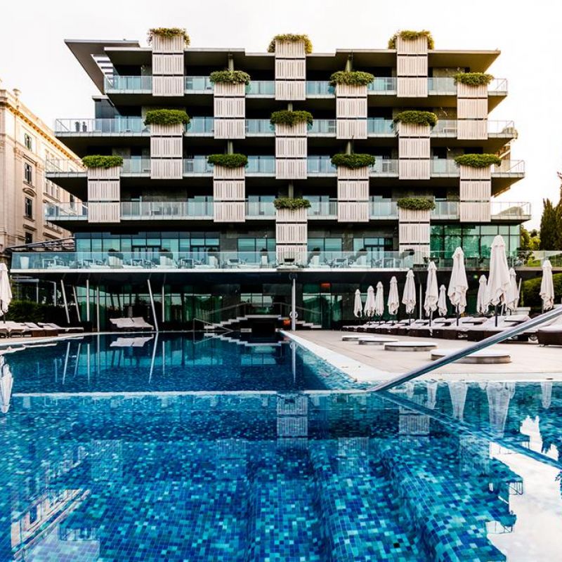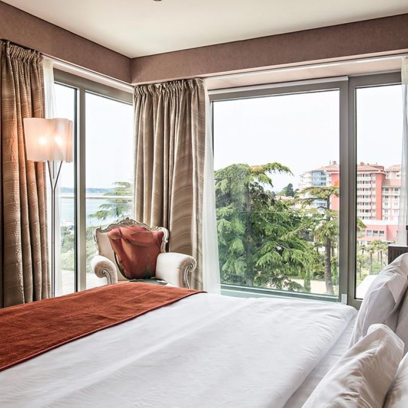 Luxusní hotel v centru Portorože, uprostřed památkově chráněného parku. Bazén s mořskou vodou a výhled na Jaderské moře.