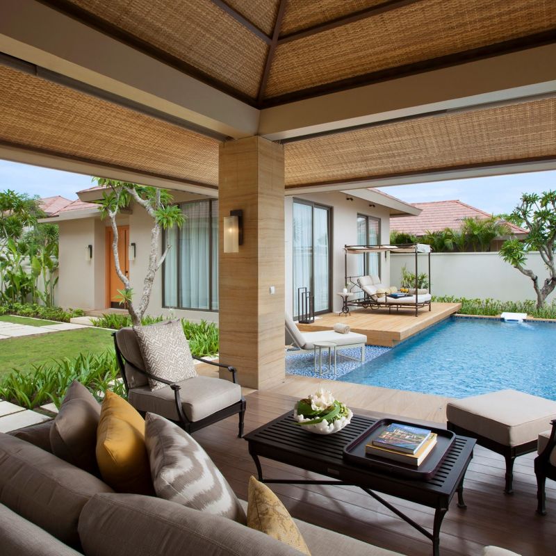 Hotelový komplex Mulia je tvořený ze 3 samostatných odlišných částí - Mulia Resort, Mulia Villas a The Mulia. Přímo u komplexu písečná pláž Nusa Dua. Velké množství restaurací, rekreačních zařízení a obchodů.